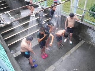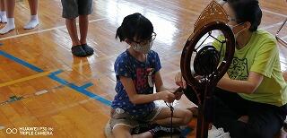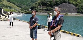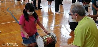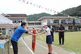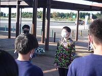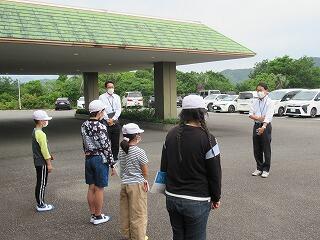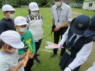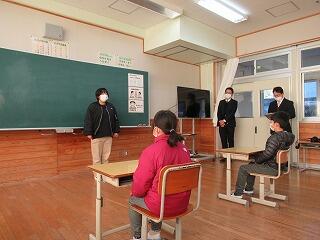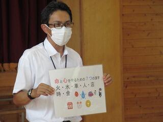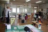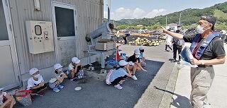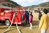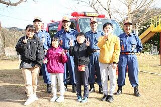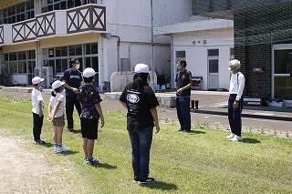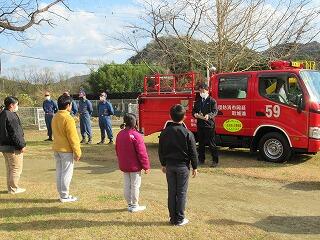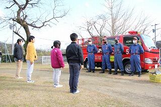 今回の避難訓練では、浦城地区の消防団(南浦第2分団第59部)の方々に指導していただきました。日頃から消防団の方々が地域の防災のために活動してくださっていることなど、地域の方々の活動について知り、ふるさと浦城への理解を深めることもねらって来ていただきました。