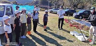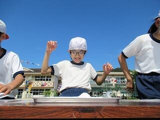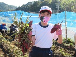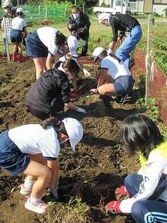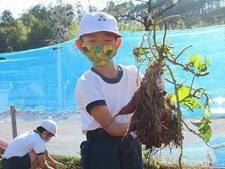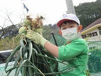 10月26日に植えた空飛ぶ新玉ネギの収穫をしました。植えてから草取りや水やりをしながら成長を見守ってきました。雑草が元気よくて草取りには手を要しましたが、子ども達はこつこつとお世話してきました。一時、育ちがよくないと感じるときなどには、昨年からお世話になっている甲斐俊行さんに肥料や水のやり方などの指導をしていただきながら育ててきました。収穫した玉ネギは自分たちの家でいただくだけでなく、お世話になった地域の方々にも子ども達から日頃の感謝を込めてさし上げる予定です。