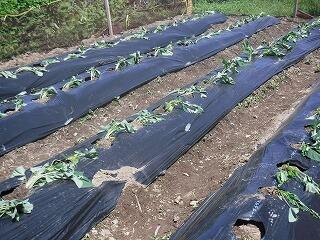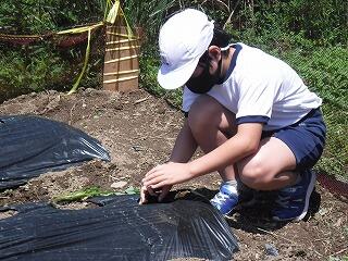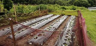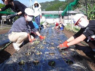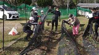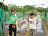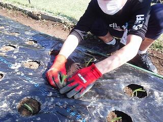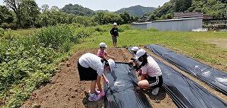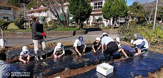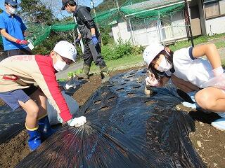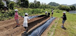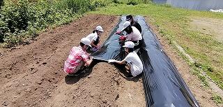 今回は、鍬を使って畝づくりをしました。慣れない上に力もいるとあって苦戦していましたが、頑張って立派な畝を完成させました。そして、マルチビニールを張って仕上げ、後日、苗を植えるばかりに仕上げました。おいしい野菜ができるように、これからも野菜作りを頑張って欲しいです。