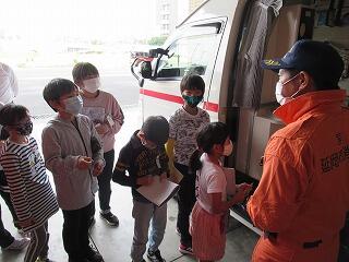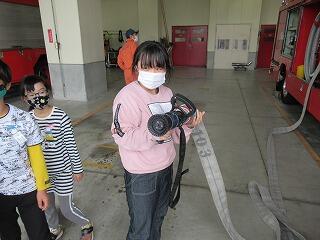 消防団の方々は、こころよく引き受けてくださり、消防車両の見学やその装備の説明をしてくださったり、日頃の活動について話をしてくださったりしました。また、実際の放水もしてくださりました。