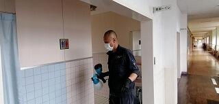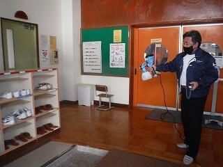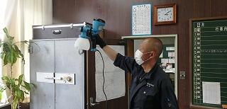 コロナ対策として、ボランティアで延岡市内の業者さんが来てくださり、学校の玄関等の消毒をしてくださいました。延岡市内の小中学校全ての学校を回ってしてくださっているそうです。