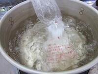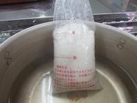 作り方 ⇒ ビニール袋に、米のかさの約2倍水を入れ、空気を抜きながらビニールの上部をしっかりと輪ゴムで止める。沸騰したお湯に15分程度入れ、火を止めて10分程度蒸らす。完成!