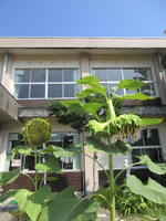 学校田の稲はたくさん出穂し、すくすくと生長しています。また、学校を照らすひまわりは、大きく生長し、頭を垂れています。種ができ始めています・・・。