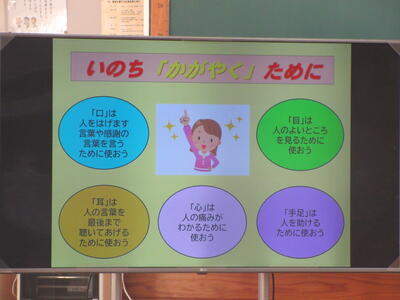 ③「目を大切にする」・・・10月10日の「目の愛護デー」にちなんで、日頃から目を大切にする具体的な実践について話をしました。「タブレットなどを30分見た後は、20秒遠くを見るようにする。」「タブレットなどの画面と目は30cm以上離すようにする。」について話しました。ぜひこれからも実践を続けてもらいたいです。
