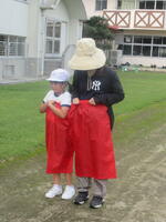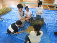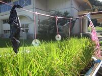 さて、学校田の稲が大きく生長し、「実るほど頭を垂れる稲穂かな」のように育った稲に、先日の朝、何とたくさんの雀が群がっていました。稲穂にぶら下がっている雀もいました。きっとおいしいお米ができていることを見付け、早速食事に来ていたのでしょう。それを受け、対策(下の写真)を練りました。その後は、雀などのお客さんは減った気がします。9月末の稲刈り・収穫が無事に迎えられますように・・・。