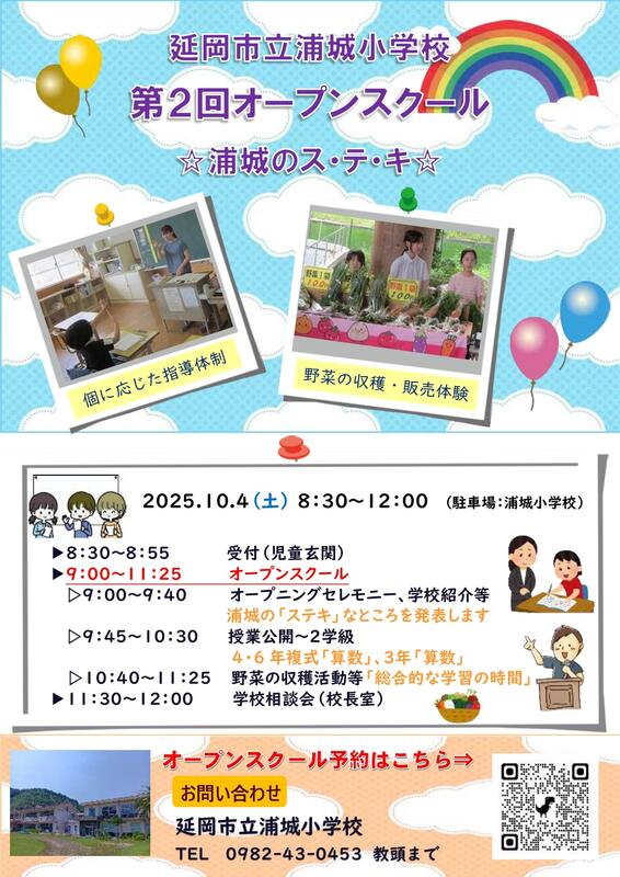 第2回浦城小学校オープンスクールのご案内です。下記の詳細内容をご覧ください。10月4日(土)は、ぜひ浦城小学校にお越しください!お待ちしております!