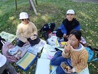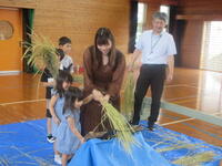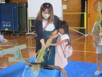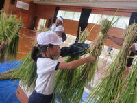 次は、「実りの秋」。順調に育った稲を、今週の天気を考え、早く稲刈りすることになりました。稲刈りの経験がある子とない子がいますが、鎌の扱いに気を付けながら、実った稲を一株一株(約75株ありました)刈り取っていきました。子どもたちの刈り方がとても上手でした。その後、刈り取った稲を体育館の特設干し場に干しました。どれだけのお米が収穫できるか楽しみです! 雀たちに少しお裾分けしましたが…。
