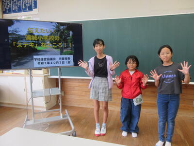 1つ目は、子どもたちによる「浦城小のステキなところ」の発表です。子どもたちが考える「ステキ」を言葉や写真を使って説明したり、日頃よりお世話になっている委員の皆様に感謝の気持ちを伝えたりすることができました。