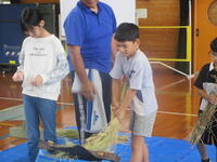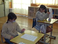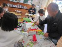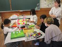 4年生 ⇒ 図工「つなぐんぐん」では、新聞紙を細く丸めた棒状の物を組み合わせて三角形を作りながら、空間を形作ったり、広げたりして完成させていました。自分の考えを伝えながら、友達と仲よく協力して製作する姿が印象的でした。たくさんの友達と笑顔で交流していました。