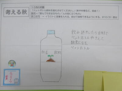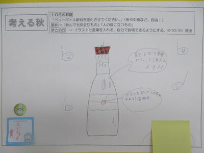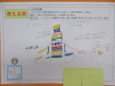 先月の全校朝会で、「考える秋」と題して、子どもたちに一つお題を出しました。そのお題は、「ペットボトル飲料を進化させてください。」でした。子どもたちは、10月中に、自由な発想でイラストと言葉でまとめてきてくれました。提出の際には、自分の思いや考えを説明してくれました。子どもたちの発想力はすごい!と改めて感じたところです。ぜひご覧ください。