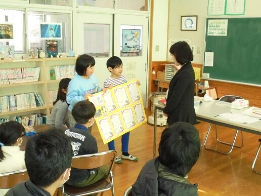 その後、4年生が社会科で調べた安全について1年生に発表しました。