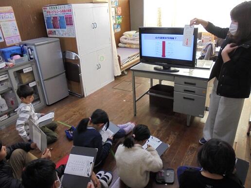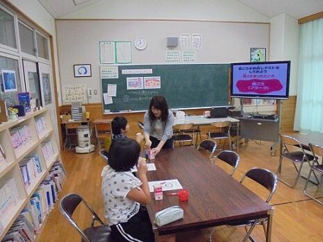 カラーテスターを使った授業で1年生は正しい歯の磨き方を学びました。