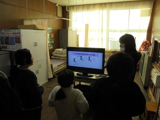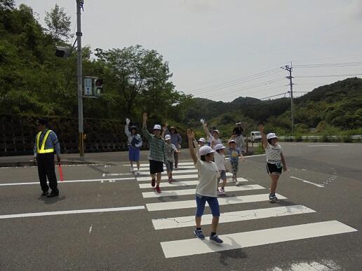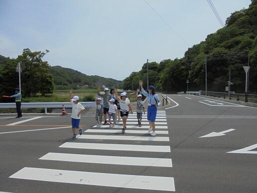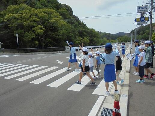 カーブミラーの取り付けてある場所や横断歩道の渡り方等についてクイズ形式で説明しました。