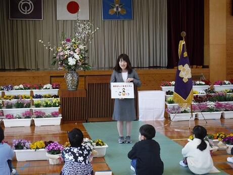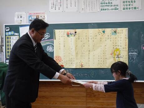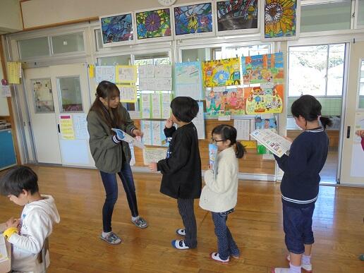最後にクイズに全問正解した1年生に手作りのカードとバッジを渡していました。