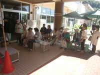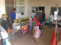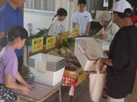 7月4日(木)、野菜販売はグランドオープンを迎えました。時間前から多くの方が集まってくださり、約20名ほどのお客さんが待っておられました。今回から、混雑を避けることとできるだけ均等に品物を買っていただくために、事前に整理番号くじをひいていただき、その番号順に並んで買い物をしていただくようにしました。