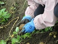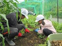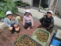 7月2日(火)、ようやく降り続いていた雨がやんで、いもほりができる日が来ました。4月5日に植えたジャガイモが実ってきたので、みんなで掘りました。ジャガイモはあまり深いところにはないので、簡単に掘り出していくことができました。収穫したジャガイモは約4㎏、野菜販売に活用します。