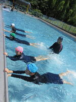 7月8日(月)の午後は、港小との合同の水泳学習でした。港小と混じって、それぞれのグループで水泳の学習をしています。下学年は5人で水遊びなどをしています。本校の2年生もみんなと一緒に浮く運動をしたり、もぐったりして、水遊びがたくさんできるようになりました。高学年は、25メートルから50メートルまで挑戦しています。どんどん距離を伸ばしていけるようにがんばっています。クロールも平泳ぎも50メートルまでもうひとがんばり、がんばっていきましょう。