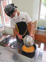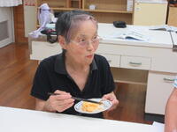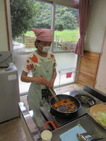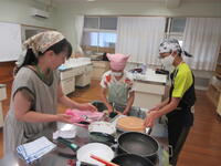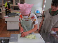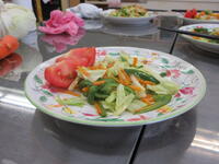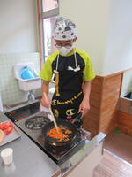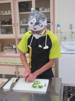 野菜の分量を量り、それぞれの野菜を切りました。にんじん、キャベツ、ピーマンとそれぞれの切り方ができました。炒める作業では、手早くすることが大事です。炒まっている野菜の様子を見ながら、味付けまでできました。彩りよく盛り付けもできました。試食していただいた先生方からは、野菜が柔らかくなっているという評をいただきました。