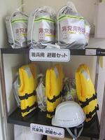 本校では、地震や津波、風水害など、万が一に備えての防災グッズ(避難セット)を常備しています。児童用はもちろん、職員用もあり、避難してから数日間必要なグッズ(水やご飯、トイレットペーパー、レインコートなど)が非常用持ち出し袋に入っています。先月の地震・津波時の避難訓練でも、防災頭巾をかぶり、避難セットを持ち出して訓練をしたところです。