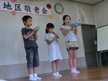 ところで、16日(日)に浦城区の敬老会が開催されました。本校からも4,5,6年生、5名が参加し出し物を
