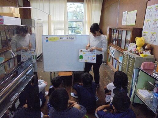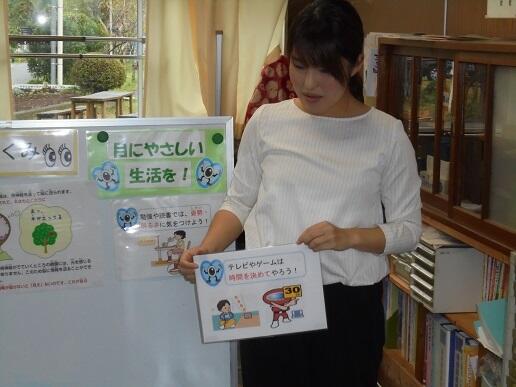 目の中には水晶体があることや近くばかりを見ていると目が緊張することなどを
