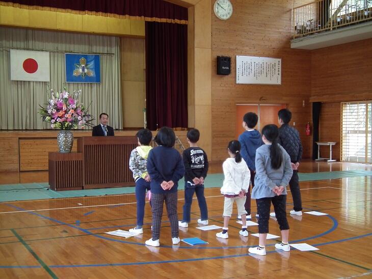 校長先生の話。1年間よく頑張り、みんな成長してきたことをほめました。