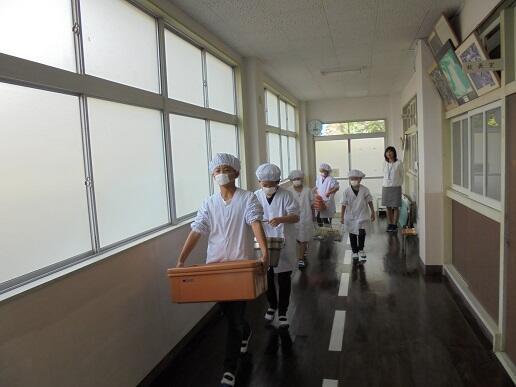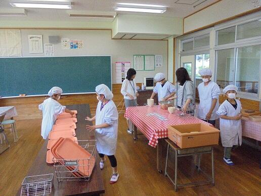 みんなで、ごはん、大きいおかず、小さいおかず、牛乳、食器を運びます。