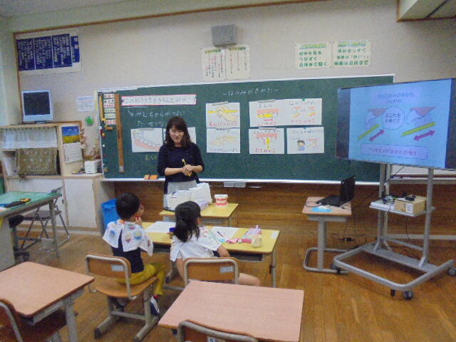 カラーテスターを使った授業で1年生は正しい歯の磨き方を学びました。