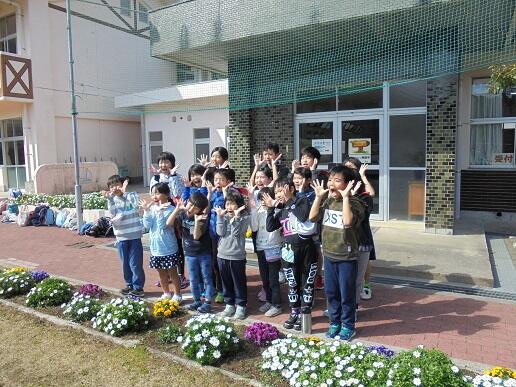 今日は全校児童、保護者・地域のみなさんで見送りました。