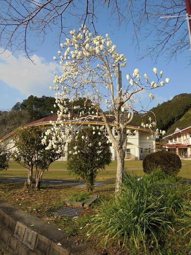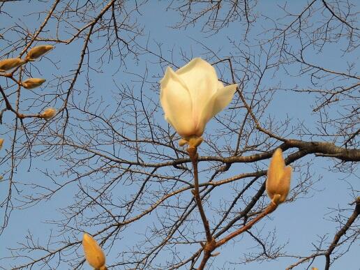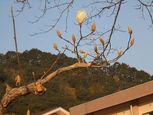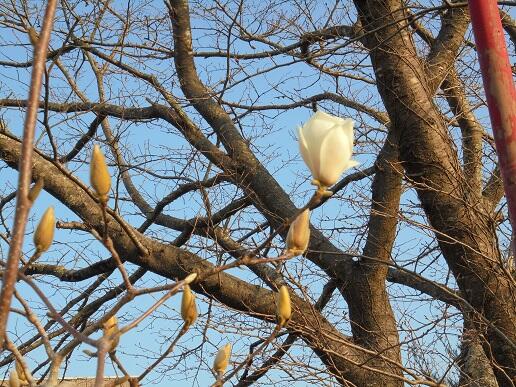 今朝学校に来てみると、ハクモクレンの花が咲いていました。