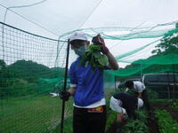 ほうれん草の収穫は、5年生と1年生で行いました。土に生えているほうれん草を収穫するのは初めてで、懸命に茎を引っ張ってから根元をはさみで切っていました。たくさん土もついています。まさに取れたてです。