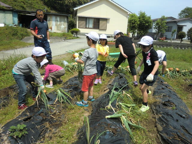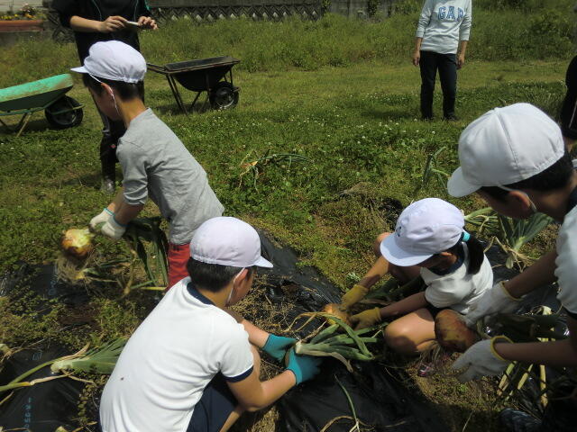 今日は、学校農園のたまねぎを収穫しました。