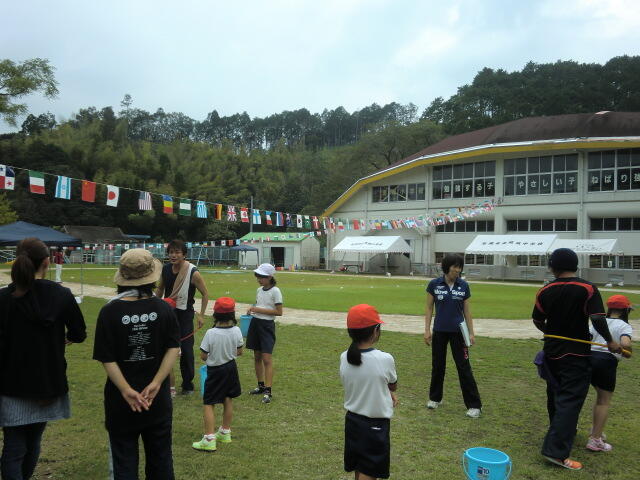 子どもたちは、運動場と体育倉庫、体育館にそれぞれ分かれての作業です。