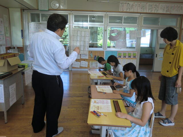 今日は、延岡市中川原町の珠算塾 延岡旭珠友会の今村 聖(いまむら きよし)先生にお越しいただき、3,4年生が珠算の学習をしました。