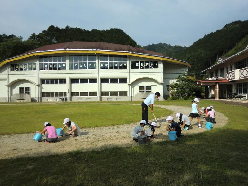 これは、まだ午前8時前の運動場の様子です。集団登校してきた子どもたちはすぐに全員で運動場の整備を始めます。教頭先生の指導の下、毎日せっせと働きます。嫌々やっている子は一人もいません。本当に働き者です。