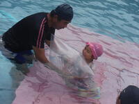 まずは、動きにくさを体験した後、どのように浮いていくかを体験していきました。ペットボトルやミニバレーボール、ビニール袋なども使いながら、背浮きができるようにしていきました。