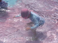 1年生は、水の中にあるたくさんの宝(ゴム製の石など)を拾うことをめあてにがんばりました。たくさん拾うことができ、水に慣れることができました。