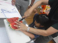 早速、家庭科室で切って、みんなで試食しました。1年生は初めてのスイカ、味わいながら食べていました。5年生は「あまい、あまい」と言いながらスイカをほおばっていました。