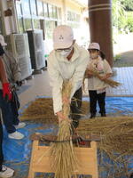 10月18日(金)、稲の脱穀作業を行いました。10月のはじめに刈り取っていた稲を、千歯こぎを使って脱穀しました。昨年もこの道具を使って作業をしているので、やり方はみんな分かっていました。しかし、1年ぶりの千歯こぎ、うまくわらを引けずにもみが落とせない様子が見られました。道具は使い方次第なので、どんなふうにしたらうまくもみが落とせるか、試行錯誤しながら作業しました。最後の方では、2年生も6年生もコツを得て、もみを落とすことができました。活動の終わりに、脱穀したもみの量をそれぞれ予想してから計量しました。わらが混じってはいましたが、3㎏ありました。2年生の予想が大当たりでした。