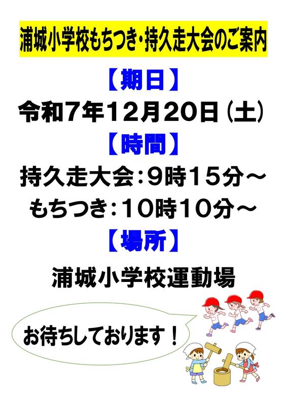 「餅つき会」・・・子どもたち・保護者・地域の方々と一緒に行います。豚汁のふるまいもあります。地域・家庭・学校の交流ができるよい機会です。みなさん、どうぞ浦城小におこしください。お待ちしております。