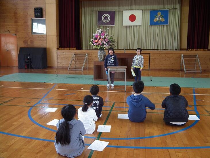 校長先生の話。1年間よく頑張り、みんな成長してきたことをほめました。
