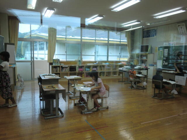 上の写真では、左側に4年生、右側に3年生がいます。互いに背を向け合っての学習です。
