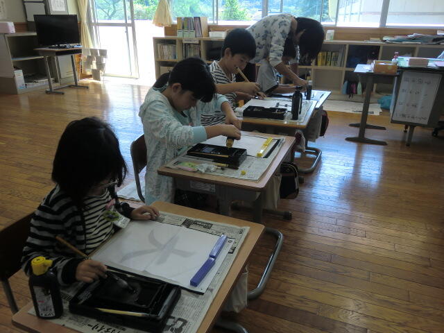 3,4年生は、毛筆習字をしていました。みんな姿勢よく練習していました。