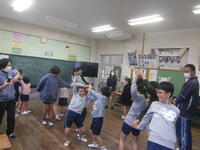 学校に着いて早速2校時(港小の校時です)、全校で音楽をしました。まずは自己紹介などをしました。そのあと、じゃんけん列車やなべなべそこぬけなどの音楽ゲームをして交流しました。とても楽しくできました。