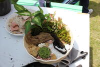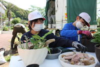 自分で、思い描いたミニ庭園を、花、石、コケなどを使って作っていきました。それぞれ、個性あふれる寄せ植えになっていました。
