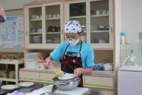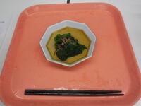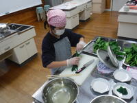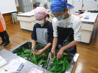 5年生の調理実習では、収穫したほうれん草をゆでて、水にとりました。ちょうどよい大きさに切って、「ほうれん草のおひたし」を作りました。できた料理は、先生方にも試食してもらいました。自分たちが育てた野菜を、自分たちで収穫し、自分たちで調理して食べる、とてもおいしく感じたのではないでしょうか。