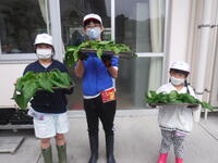 ほうれん草の収穫は、5年生と1年生で行いました。土に生えているほうれん草を収穫するのは初めてで、懸命に茎を引っ張ってから根元をはさみで切っていました。たくさん土もついています。まさに取れたてです。