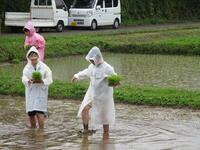 雨混じりの中、上南方小中学校の近くの田んぼで田植えがありました。