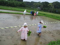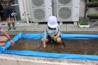 はらわく(6月10日の田植え)の経験を生かして、5年生がリーダーとなり、とても上手に苗を植えていました。1年生もとても上手に植えることができました。子どもたちの力で田植えができました。