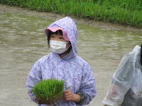 足が取られ、雨も降り、なかなか大変な環境でしたが、班の指導者の先生や友達にも助けられ、約7aの田んぼの田植えをがんばりました。